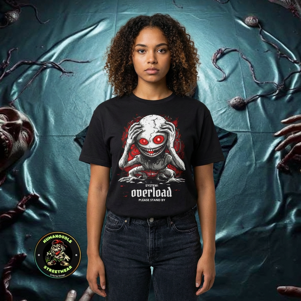 This black graphic tee wears its edge loud and proud. A manic, wide-eyed creature clutches its skull as crimson circuitry and static pulse behind it — the word “overload” sits beneath in glitchy type. The shirt feels like a midnight soundtrack: unnerving, bold, and built to last. It slips into a streetwear or gig-ready wardrobe, layering under a worn denim jacket or standing alone beneath club lights. The heavy cotton hold keeps the print crisp while the relaxed cut lets you move without fuss. For those who collect darker, tech-noir aesthetics, this tee reads like a short story you wear — unsettling, memorable, and unmistakably you.